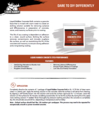 Liquid Rubber Concrete Etch contains a granular base, that is mixed with warm water to create an etching solution suitable for removing Laitance and Efflorescence in preparation of concrete, stone, and masonry surfaces prior to coating. The life of any coating is dependent on adhesion to a clean, sound surface. Etching the surface removes contaminants and minutely roughens the surface, as well a neutralizing the PH of the concrete and masonry, to ensure strong adhesion and a long-lasting coating.