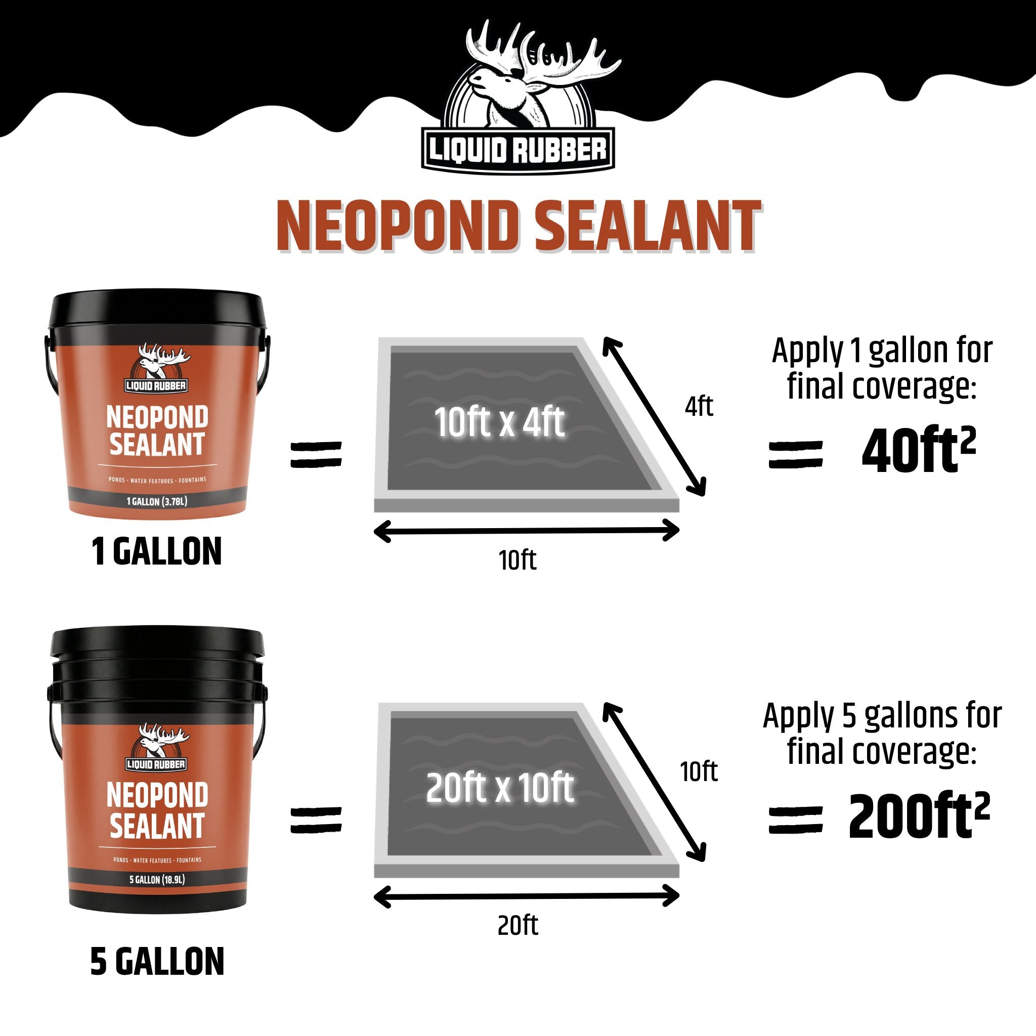For Best Results: Apply product when air and surface temperatures are between 10-30°C (50-86˚F). Do not apply in humidity over 80% and avoid applying in direct, intense sunlight. Do not apply if rain is expected within 24 hours or if dew covers the surface. Using a 3/8’’ (10mm) roller, apply approximately 3-4 coats Liquid Rubber NeoPond Sealant. Allow at least 4-6 hours drying time between coats. You can recoat after the material is dry to the touch with nothing wet underneath and it is uniform in color. Apply each new coat at a different angle to the previous coat to ensure even coverage. For edges and corners apply using a nylon/polyester brush.